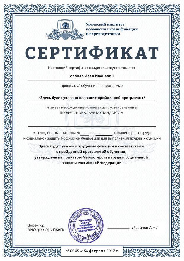 Заполненные образцы выдаваемых документов есть в описании учебных курсов и на странице «Лицензия. Документы», а также на главной странице официального сайта АНО ДПО «УрИПКиП».